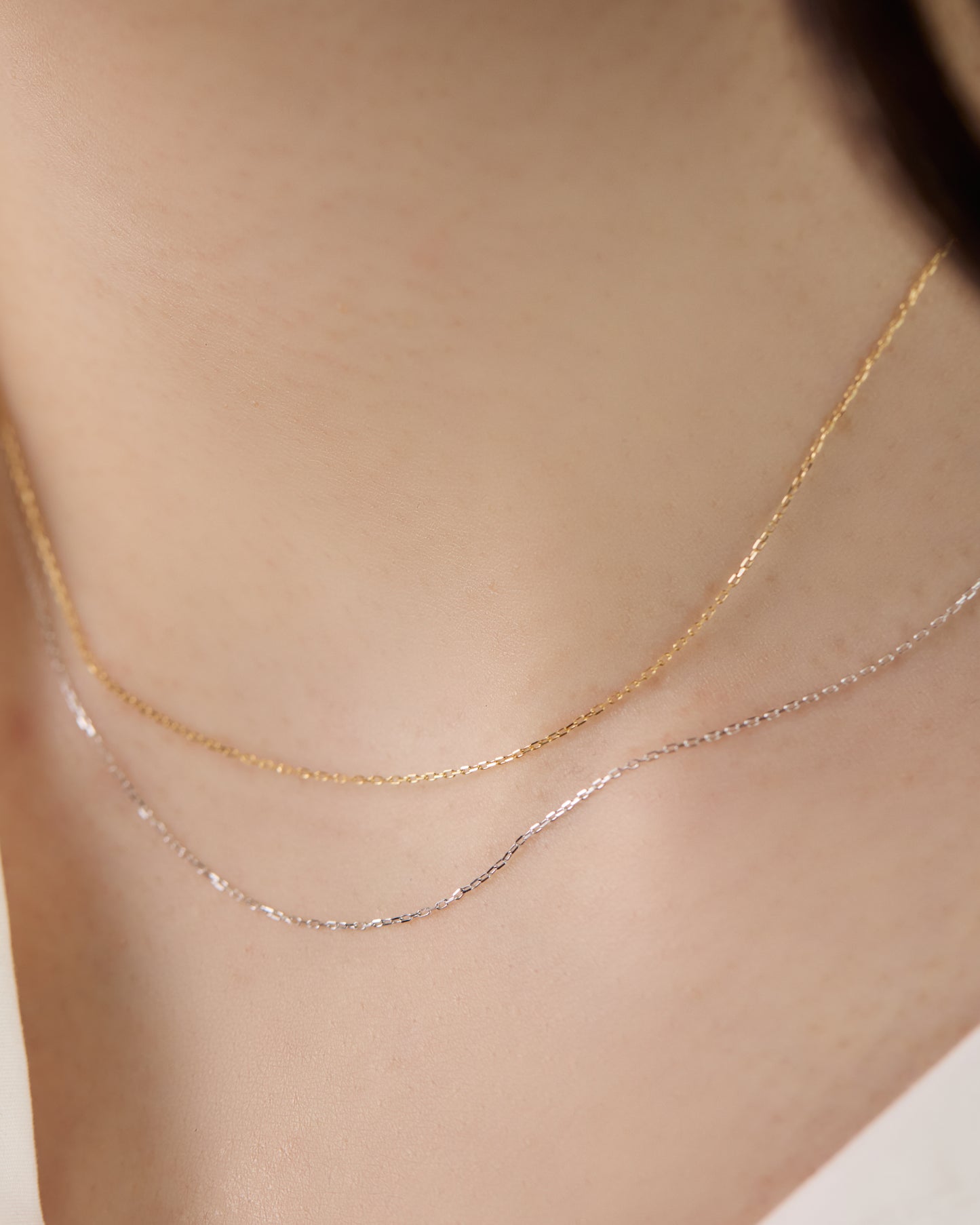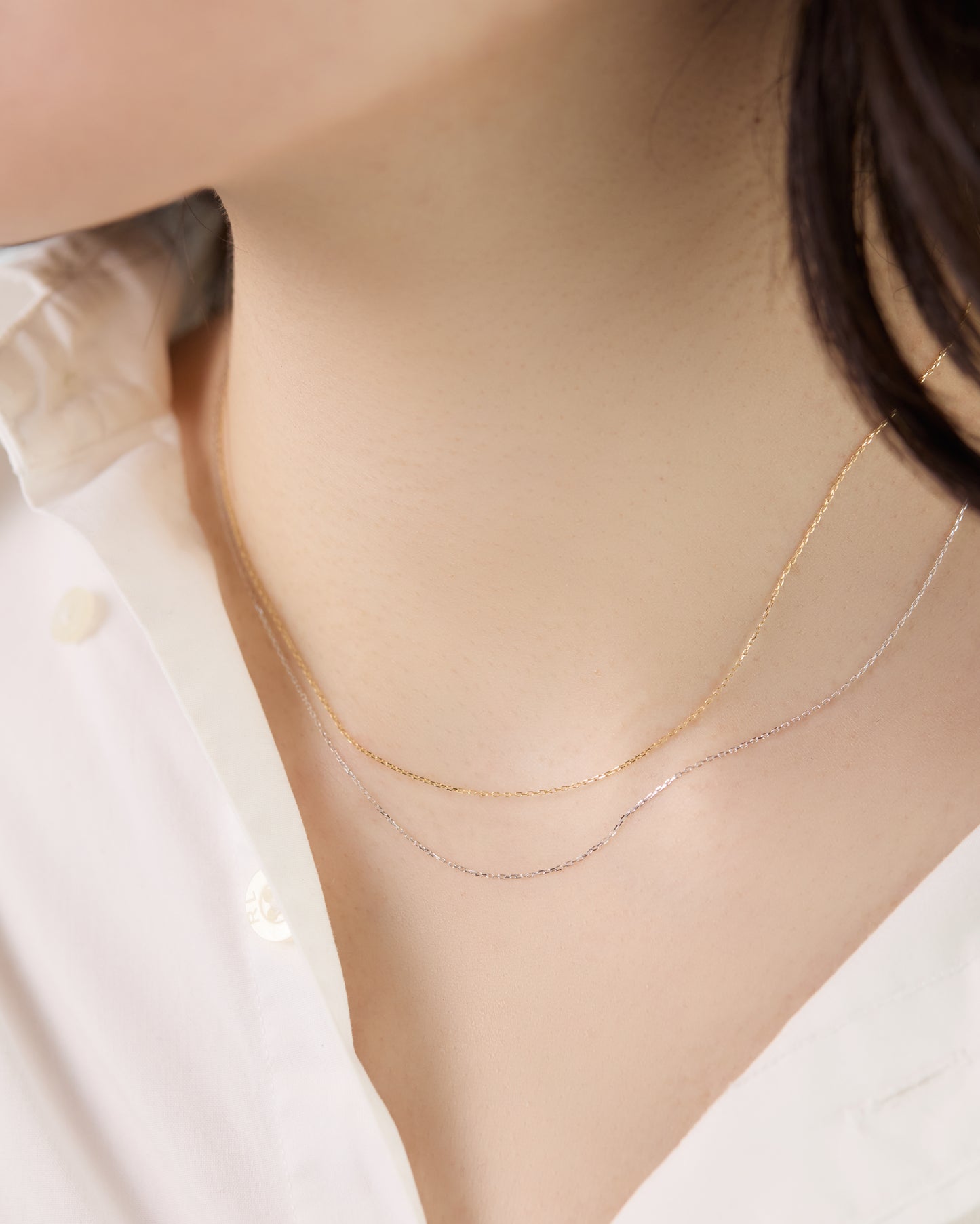 日本でつくられているなかで最も細いアズキチェーン。動きに合わせてさりげなく輝きます。ペンダントトップを通したり、スキンジュエリーとしてそのまま着用したり。コーディネートが楽しいアイテムです。