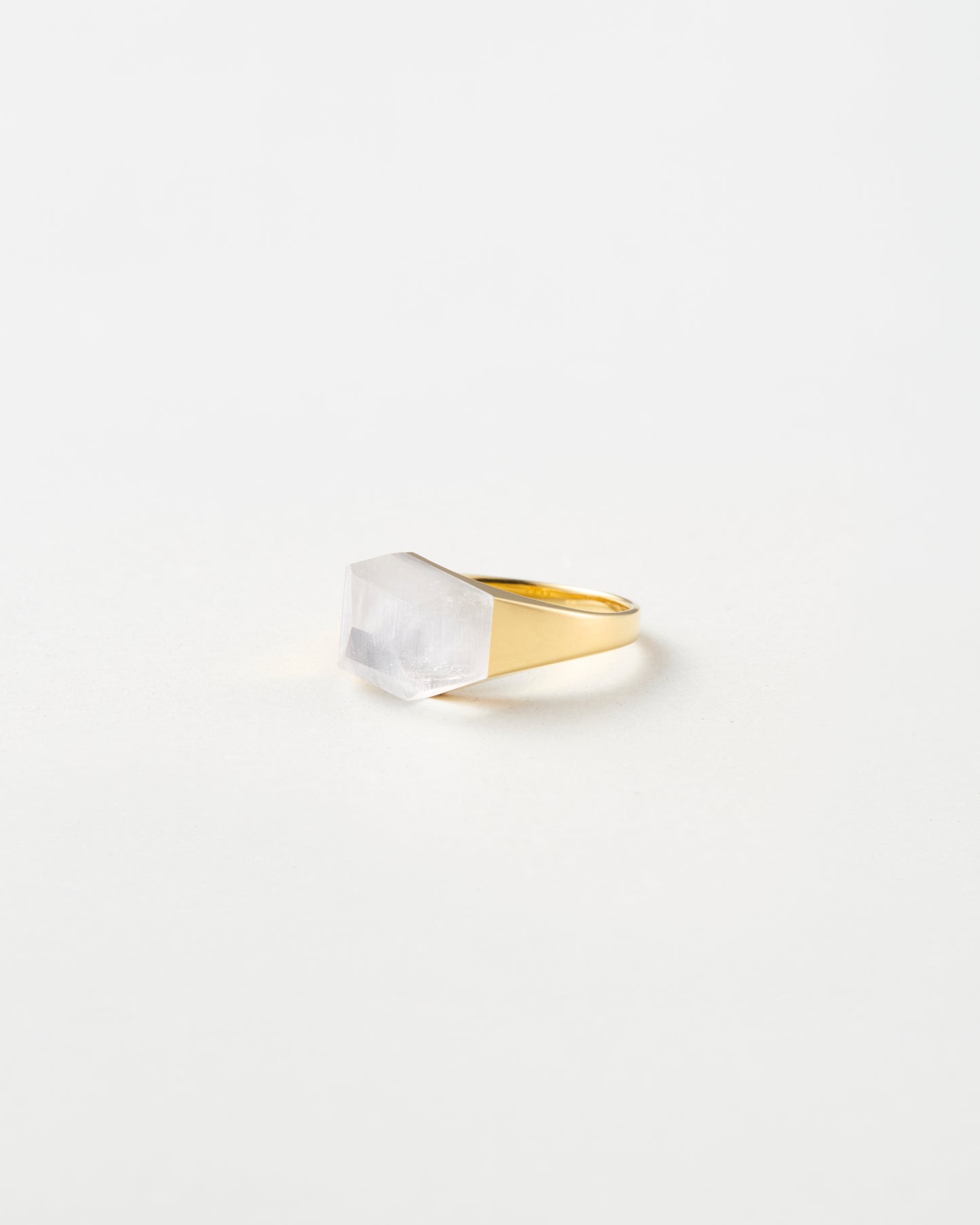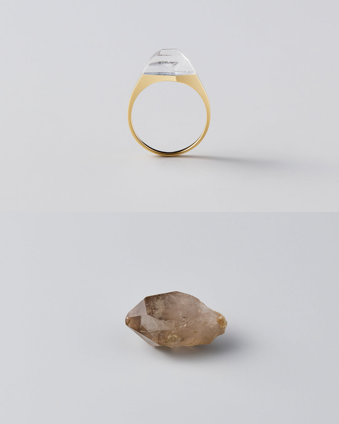 信頼するコレクターから譲り受けた原石は、澄んだ輝きをたたえた水晶。bororoならではの感性と職人の手仕事で、ひとつのジュエリーへと昇華しました。