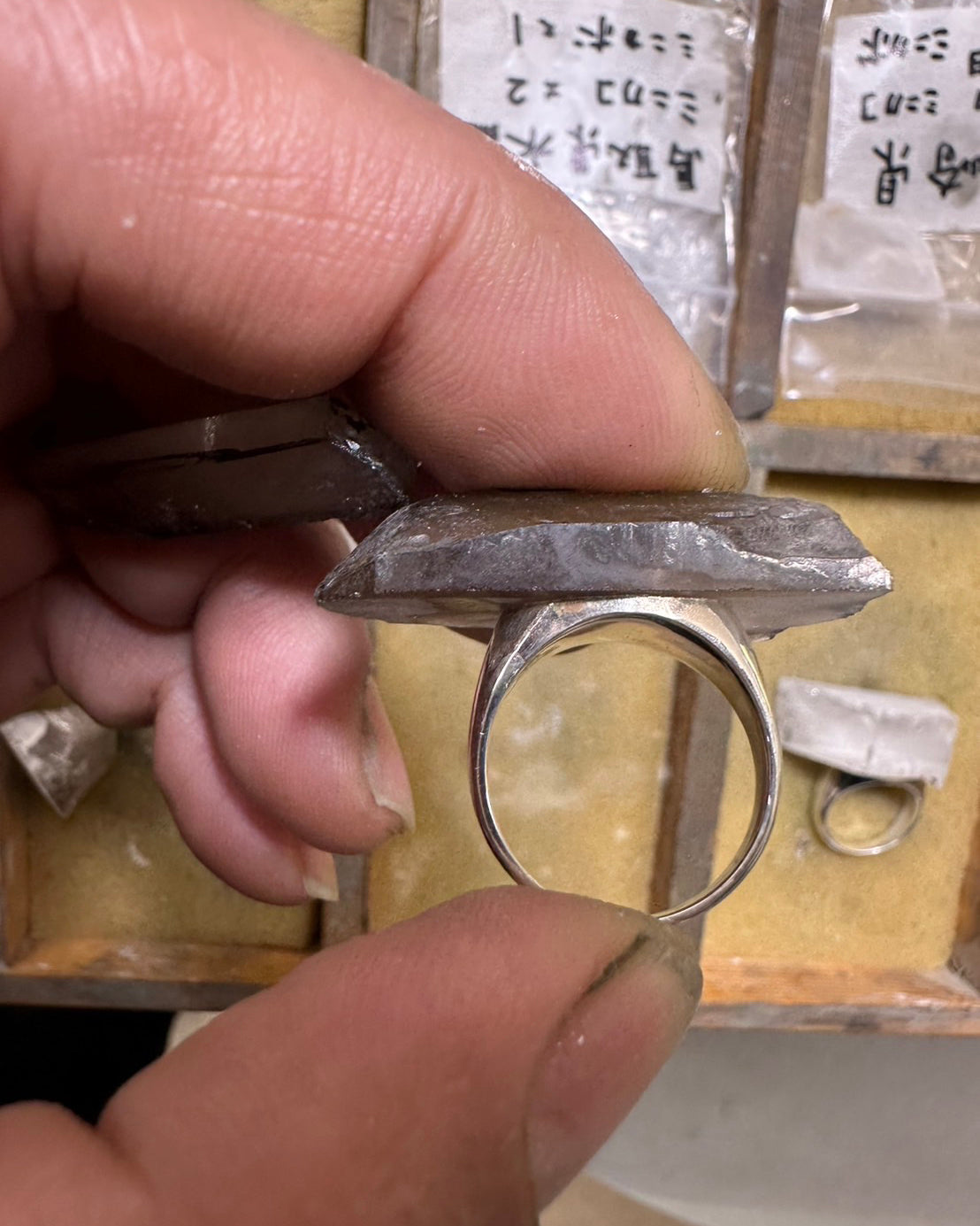 天然石の宇宙を覗く 結晶が育つ過程で現れる色の濃淡。 閉じ込められた内包物。 天然だからこそ現れる石の個性を可能な限り美しく見せるのがロックシリーズです。 石の歴史をそのまま切り取ったような存在感のあるフォルムは、着用するだけでなく、眺める楽しみも持ち合わせています。 石と地金のシームレスなデザインは、日本に古くから伝わる貴石彫刻の技法「同擦り」によって仕上げられています。 手掛けるのは、甲州貴石彫刻の第一人者、詫間宝石彫刻。 多種多様な石の性質を見極めそれぞれの個性が引き立つ美しさを追求します。