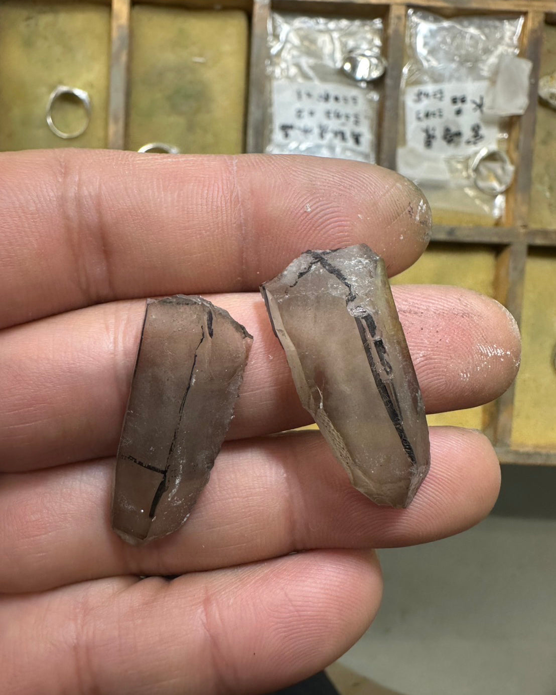 周辺には良質な石英や水晶を含む鉱脈が点在し、なかでも淡く煙をまとったようなスモーキークオーツは、照りと透明感に優れた美しさをたたえています。