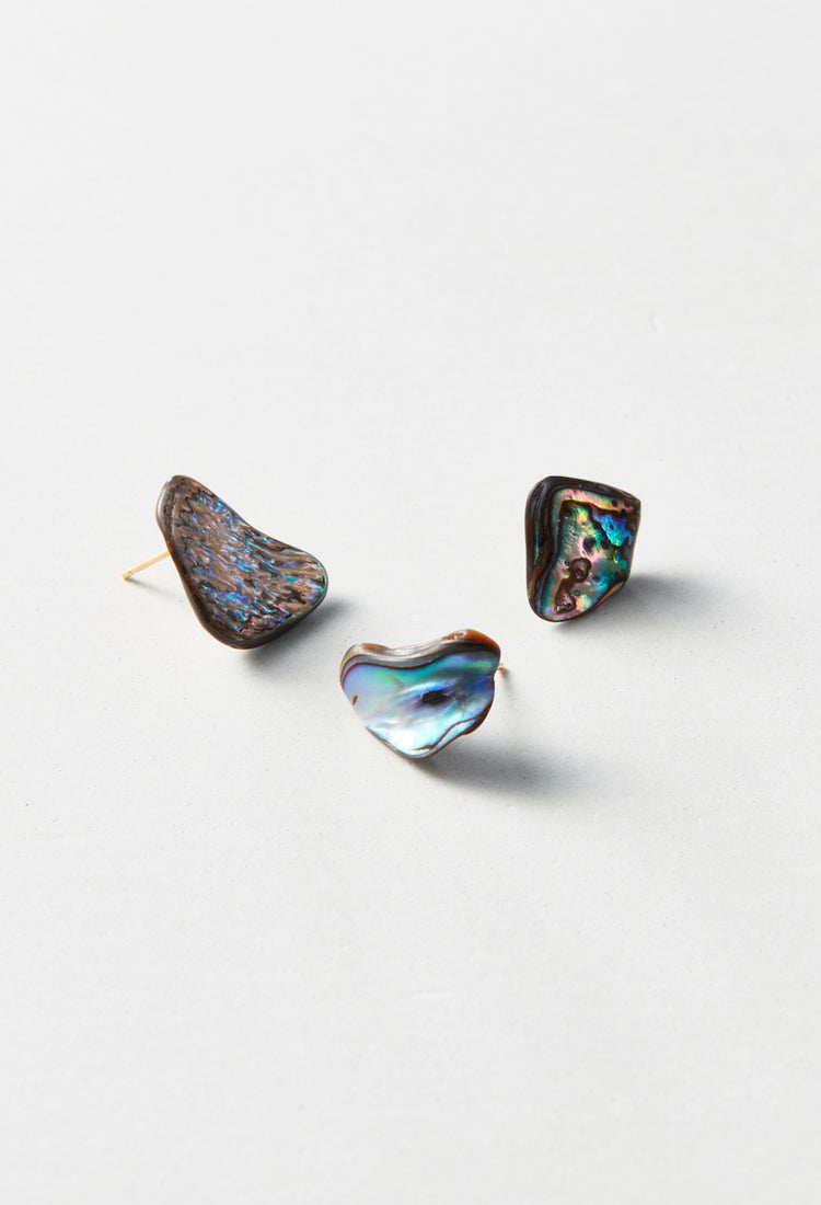 Indonesian abalone shells. We took out the beautiful luster of the shells and made them into earrings. The organic shape, cut out of thick parts, blends naturally into your ears. Abalone is well known for its edible food, but in fact it also grows pearls. For this reason, the abalone shell is also known as the "Mother of Pearl."