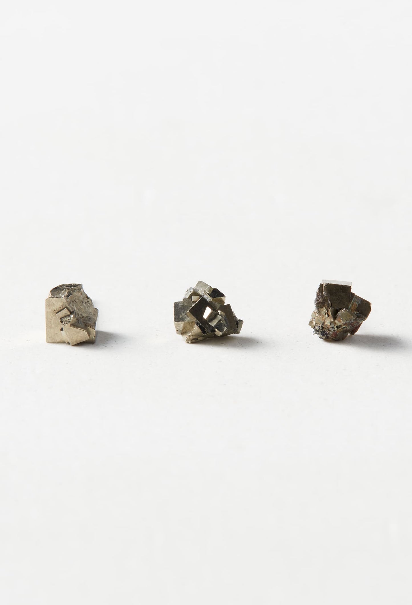 Pyrite belongs to the crystal group called the equiaxial crystal system, and is a cube that is easy to produce. The stone is processed to make the sharp edges just a little smoother, and the stone is finished with the same atmosphere as it was produced.